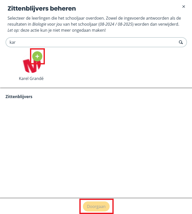Er opent aan de rechterkant een scherm waarin je je leerlingen die zijn blijven zitten kunt zoeken op naam. Klik op het groene plusteken rechtsboven de naam van de leerling. Heb je alle leerlingen aangevinkt? Klik dan op 'Doorgaan'.