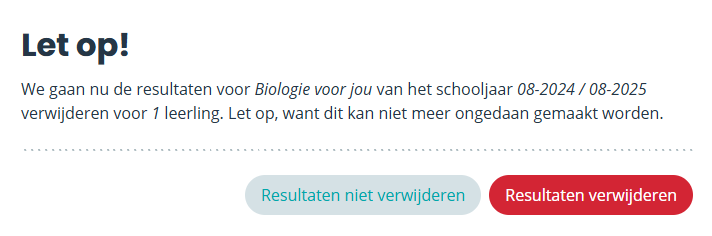 Je krijgt nu een waarschuwing waarin staat dat alle resultaten van het vorige schooljaar gewist worden. Wanneer je op 'Resultaten verwijderen' klikt wis je alle resultaten van de aangevinkte leerlingen.